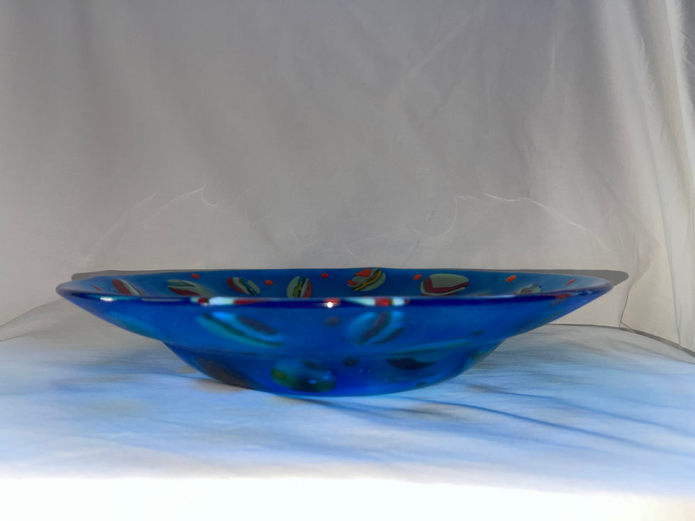 Large 38cm bowl made with glass puddles and dots on transparent blue. Puddles are made by fusing multiple layers together then smashing them with a hammer. Those pieces are then stood on their sides to display the layers and fused again, before fusing the piece together.