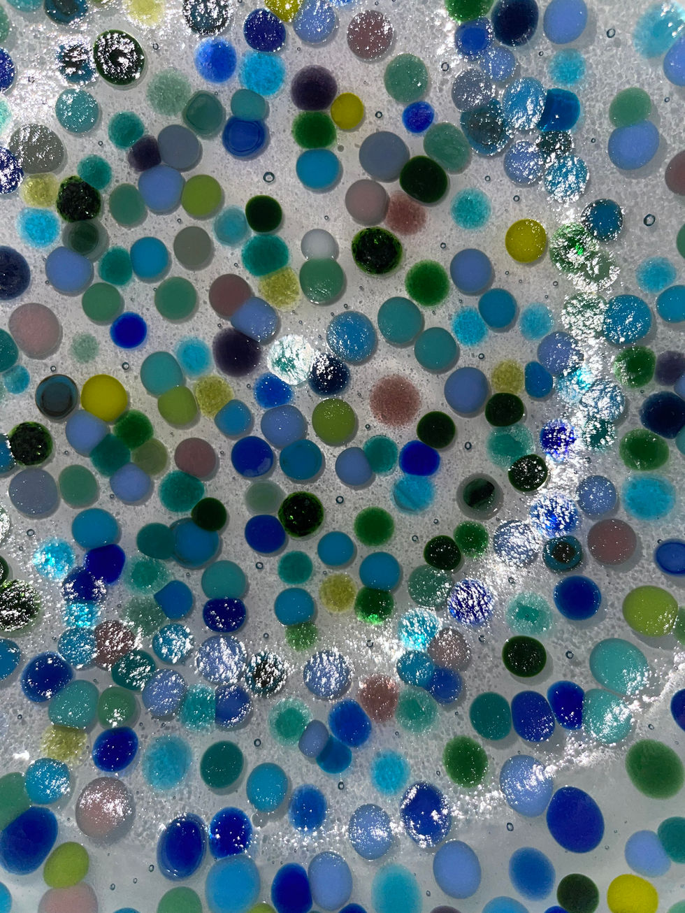 A round, shallow 29cm bowl to use as a fruit bowl or pasta dish. The subtle colours of the dots in this bowl make for a gentle but very colourful piece.