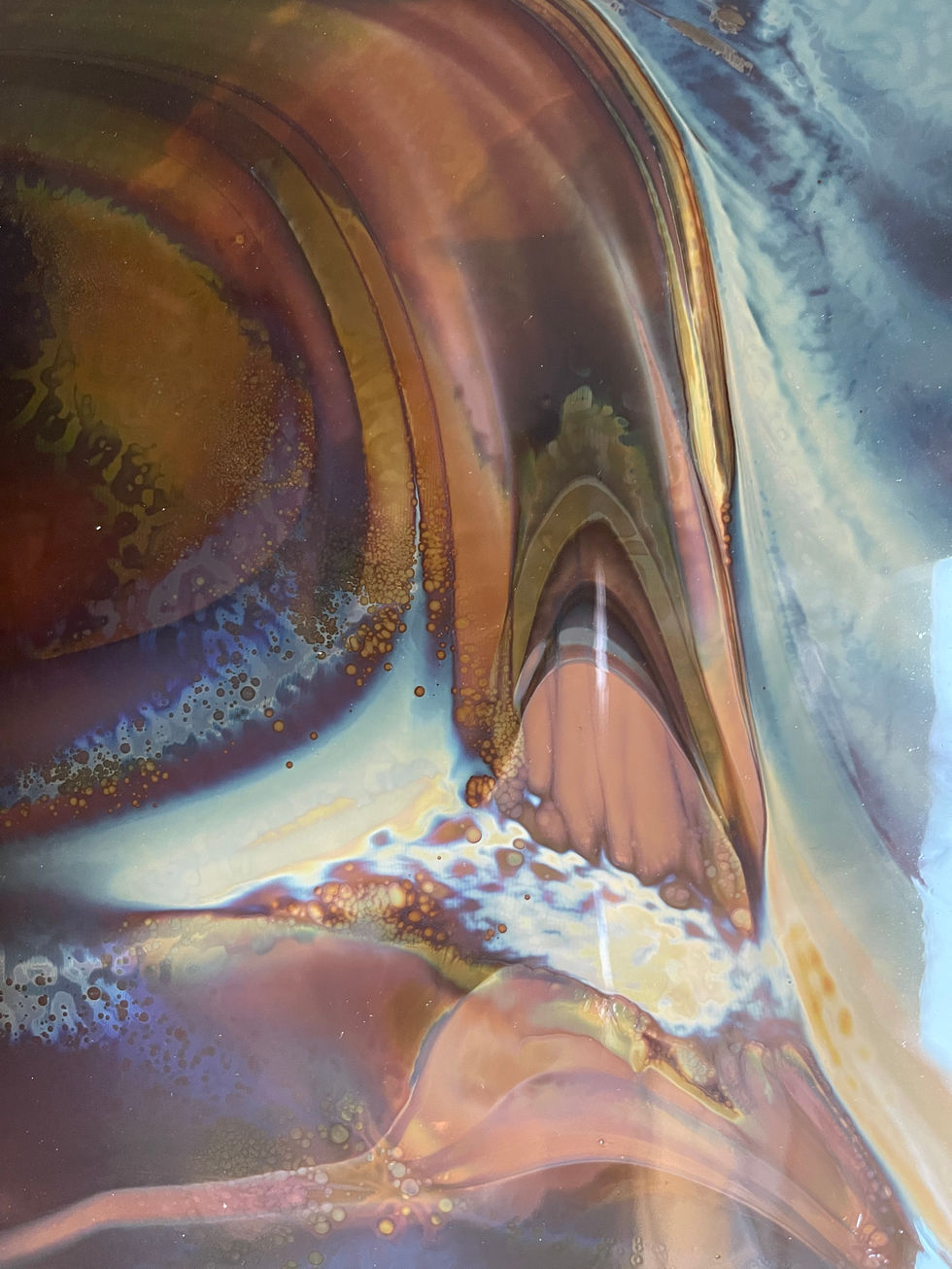 Large, rectangular 42 x 31cm platter made from two highly reactive glasses. The base blue contains copper, and the top glass has reactive elements of selenium and others. Upon firing, two quiet pieces of glass violently react together to create a vibrant wave of reds and browns reminiscent of petrified wood. Cheese knives will be fine on this piece.
